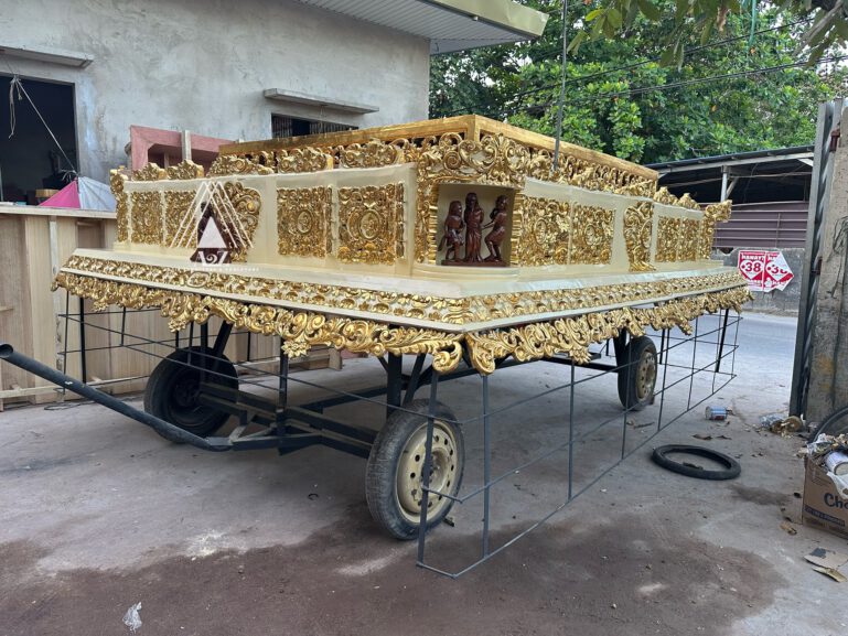 The carroza is richly decorated with brass or wood motifs, flowers, and lights, and mounted with life-sized antique dioramas, or religious heirlooms.